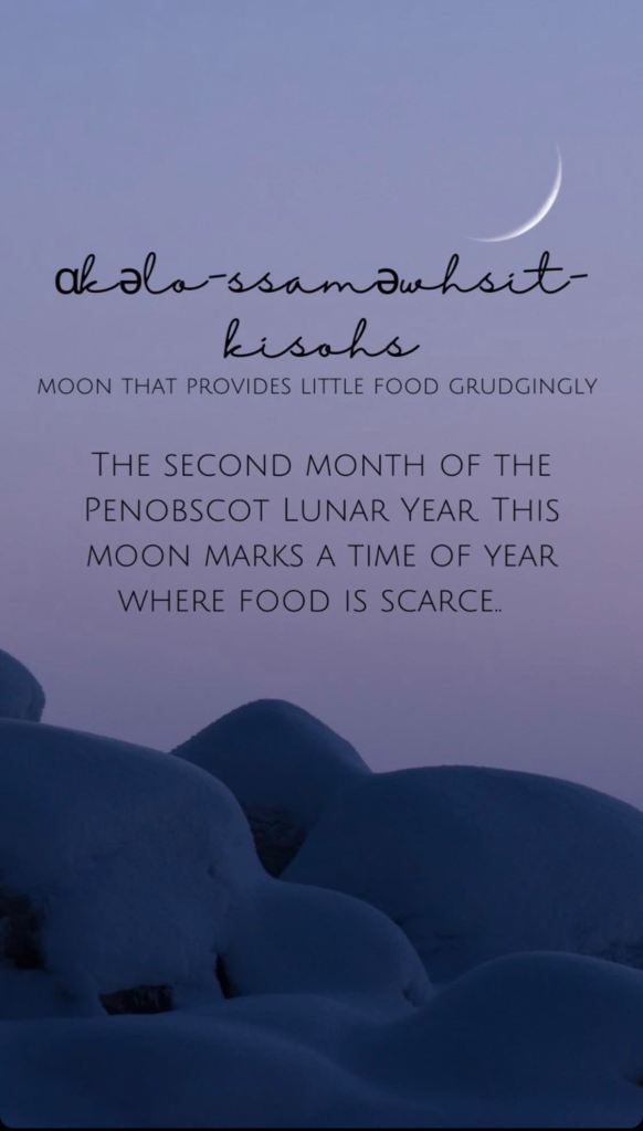 In Penobscot culture the moon is called αkəlo-ssaməwhsit-kisohs- “moon that provides a little food grudgingly” this phase is a lunar month that started at the first new moon and ends before the next new moon.