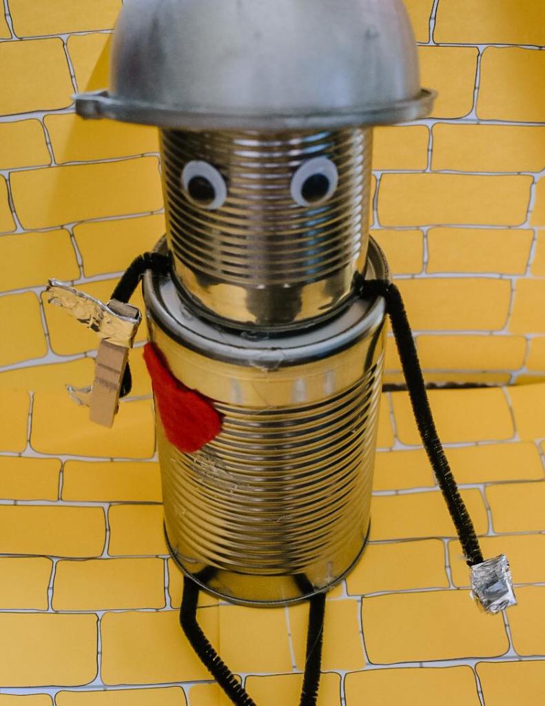 Tin Woodman- You’ll need two sizes of tin cans, a funnel, gray/silver spray paint, googly eyes, red felt, tin foil, and pipe cleaners. I used hot glue to secure everything in place. Using clean, dry tin cans I secured the two together with hot glue by gluing the bottoms to each other with a single pipecleaner (the arms) in the middle having the access hang over either side of the larger can. The funnel, I spray painted a silver color to match the rest of the Tin Man, and secured that into place on top of the smaller can. Glued the eyes to the front of the smaller can and glued two pipe cleaners (the legs) to the inside of the larger can. Using tin foil to make hands and feet. Cut out a piece of red fabric into a heart and glue to the chest.