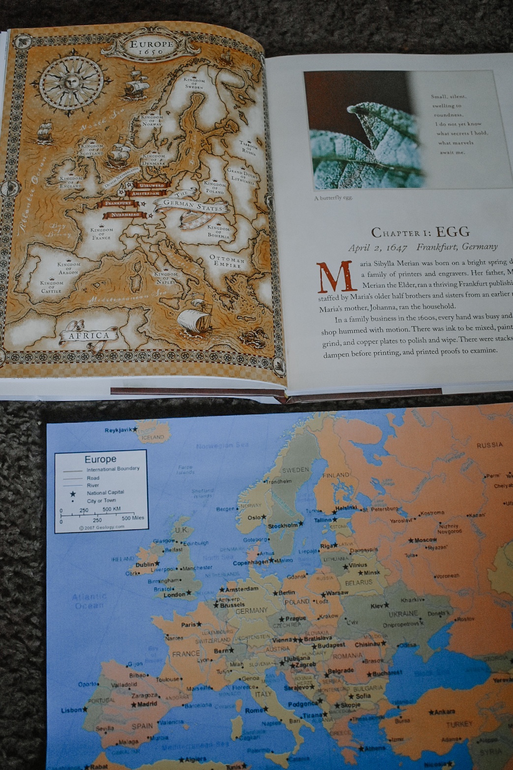 Maria Merian lived in Germany during the 17th and early 18th centuries. The map of the world during this time looked vastly different than it does now. The pre-reading project in the PDF suggests comparing the 1650 map of Europe to today’s map and observing how much has changed in 372 years. To take it a step further, we also took a look at the world map for 1650 and the route she would’ve takin to Surinam.